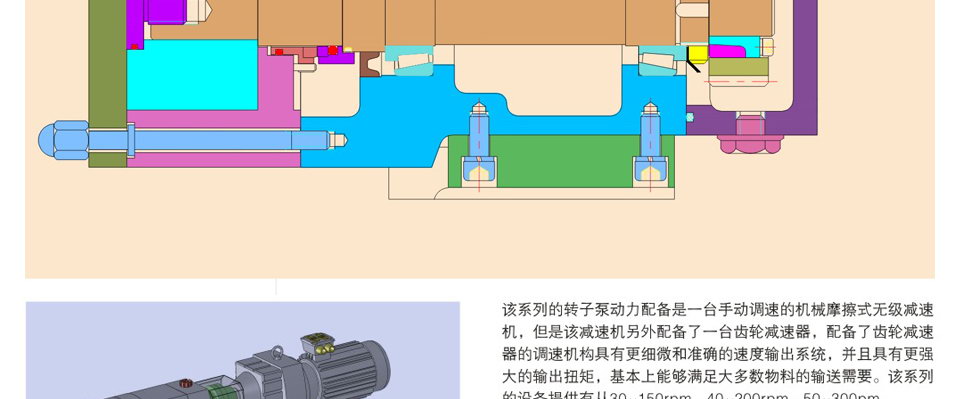 2、電機+機械磨擦式無級變速器:這種變速器的變速靠手動調節來實現,其特點是安全可靠,扭矩大,流量無級可調。缺點是非自動調節,較麻煩,調速在運轉過程中進行,不得在停機狀態下調速,其使用維護參照制造商的使用說明書。